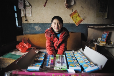 2月5日,河南確山縣雙河鎮韓樓村,留守兒童一帆從集上回來,把買來的全部年貨都擺在了桌上:3盒鞭炮、一袋煙花、一盒彩筆和一副筷子、勺子。