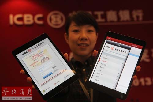 資料圖片:工商銀行工作人員在展示工行移動銀行客戶端。
