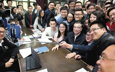 王佳明也不知道從哪里拿到自拍桿,舉起,周圍的同學迅速聚攏。“咔嚓”,他也記不清自己拍了多少張。總理說,入鏡的人有點少,咱們再一起合個影。于是,一張眾人為總理點贊的照片誕生。