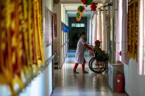 在一家敬老院,一名護理員用輪椅推著一名老人上電梯(2013年10月3日攝)。新華社記者劉金海攝