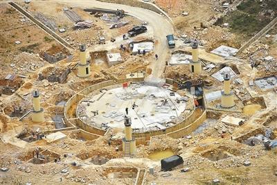 2014年4月12日,工程技術人員在進行FAST饋源艙基座的施工