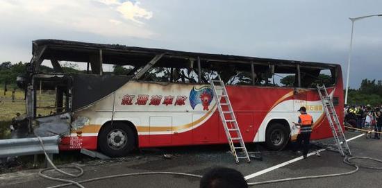圖說(shuō):臺(tái)灣游覽車(chē)起火造成26人罹難,包括24名大陸游客。這是7月19日拍攝的事故車(chē)輛。新華社發(fā)