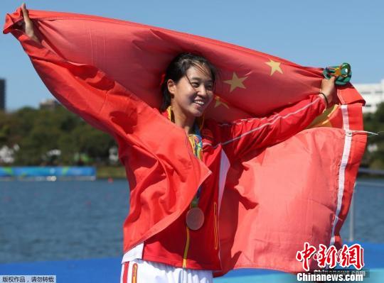 當地時間8月13日,里約奧運女子單人雙槳決賽,中國選手段靜莉以7分24秒13的成績摘得銅牌。圖為段靜莉身披國旗展示銅牌。