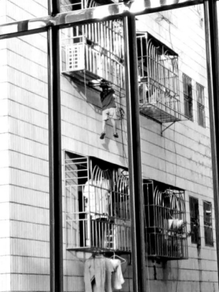 千鈞一發(fā)之際,一名30歲左右的男子沖出人群,將鞋一脫,背包一甩,沿著防護(hù)欄不到兩分鐘就徒手爬上了五樓,并迅速移動到男孩身邊。熱心男子雙腳踩著五樓的防盜網(wǎng),左手拉著防盜網(wǎng)借力,右手不停敲擊卡著男孩的六樓防盜網(wǎng),并試圖將孩子推上去。