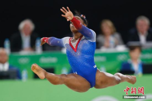 當(dāng)?shù)貢r(shí)間8月16日,在里約奧運(yùn)會女子自由操決賽中,美國名將拜爾斯以一套成套難度高達(dá)6.9的超難動作如愿摘金,這也是本屆奧運(yùn)她收獲的第四枚金牌。 中新網(wǎng)記者 盛佳鵬 攝