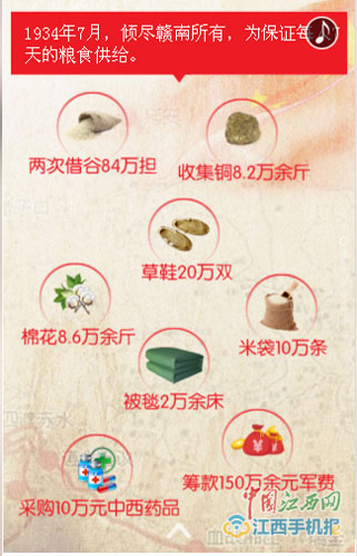 眾所周知,1934年7月,為保證紅軍二萬五千里長征路上每人7天的糧食供給,贛南傾盡所有貢獻:籌集150萬余元軍費、84萬擔(dān)谷物、20萬雙草鞋、采購10萬元中西藥品、10萬袋大米、8.6萬余斤棉花、8.2萬余斤銅、2萬余床被毯等,贛鄱兒女們?yōu)橹袊锩龀隽司薮鬆奚头瞰I。