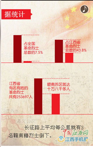 贛南,這個當年中央蘇區(qū)的核心區(qū)域,240萬贛南蘇區(qū)人口,就有33萬多人參加紅軍。長征路上,平均每一公里就有3名贛南籍烈士倒下。據(jù)統(tǒng)計,贛南革命烈士占全國革命烈士總數(shù)的7.5%;占江西省革命烈士總數(shù)的43.8%。江西省有名有姓的革命烈士共有253697人,其中贛南蘇區(qū)就達10.8萬多人。