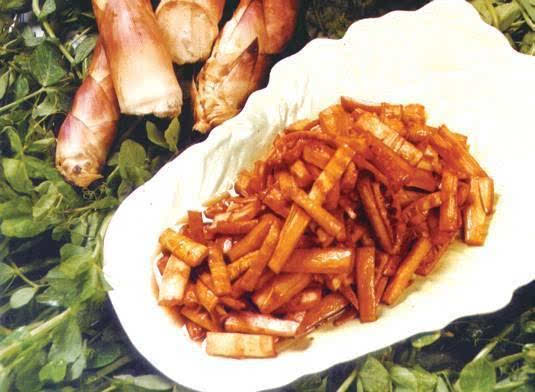 杭州《四時習俗》一書中記載說:“普通菜蔬均喜用筍。春夏之交食春筍,夏秋食邊筍……十月以后食冬筍,各種葷菜亦加筍為配料,可謂無日不筍,無食不筍。”“油燜春筍”選用杭州近郊清明節前出土的嫩筍,以重油、重糖烹制,色澤紅亮,鮮嫩爽口,略帶甜味,百吃不厭,是頗受廣大食者歡迎的一道傳統風味菜。這道菜1956 年被浙江省認定為36 道杭州名菜之一。
