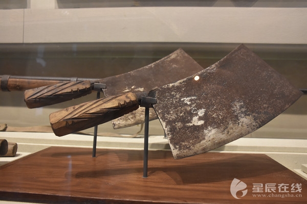 (賀龍“兩把菜刀鬧革命”的故事家喻戶曉。圖為紀念館內(nèi)收藏的賀龍率鄉(xiāng)鄰好友劈鹽務局用過的菜刀。)