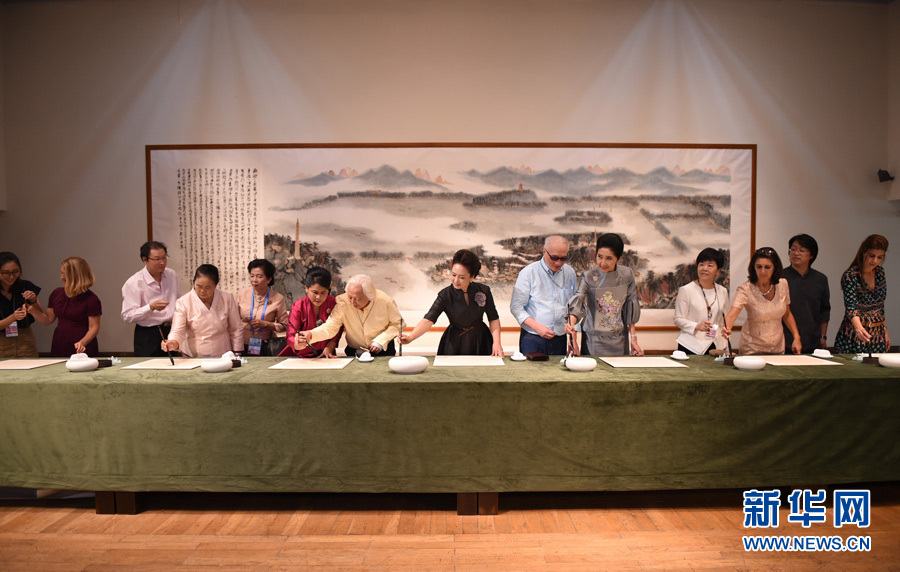 9月5日,國家主席習近平夫人彭麗媛邀請出席二十國集團領導人杭州峰會外方代表團團長夫人參觀中國美術學院。這是彭麗媛與來賓一同書寫漢字“和”。新華社記者 謝環馳 攝