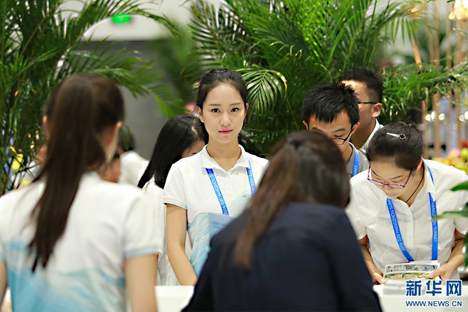 9月4日至5日,二十國集團(tuán)領(lǐng)導(dǎo)人杭州峰會在浙江杭州舉行。全球媒體人匯聚一堂,關(guān)注報道峰會盛況。在G20杭州峰會新聞中心,200多位志愿者身著青白色運動服,男生外套上藍(lán)下白,象征層巒疊嶂;女生外套上白下藍(lán),意味水波蕩漾。兩者輝映,體現(xiàn)了杭州這座古城湖光山色的獨特風(fēng)韻。“小青荷”是此次峰會志愿者的代名詞。這個名字取自宋代詩人楊萬里描寫杭州的詩句“接天蓮葉無窮碧,映日荷花別樣紅”,“青荷”也音同“親和”,他們成了G20杭州峰會新聞中心里一道亮麗的風(fēng)景。新華網(wǎng) 祝立銘 攝 圖片來源:新華網(wǎng)