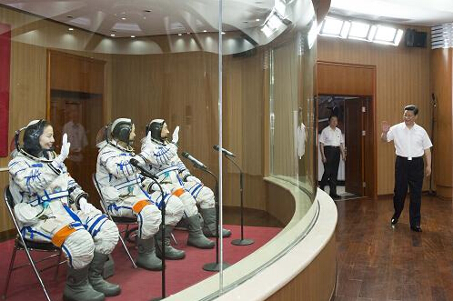 習近平來到航天員公寓問天閣,為即將出征的神舟十號航天員壯行。“你們這次執行的是我國第五次載人航天飛行任務,這承載著中華民族的航天夢。在此,我祝你們成功,期待你們凱旋。”