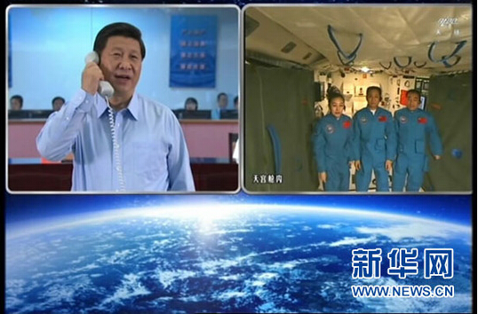 6月24日,中共中央總書記、國家主席、中央軍委主席習近平來到北京航天飛行控制中心,同正在天宮一號內執行任務的神舟十號航天員聶海勝、張曉光、王亞平通話。新華社發(截屏照片)