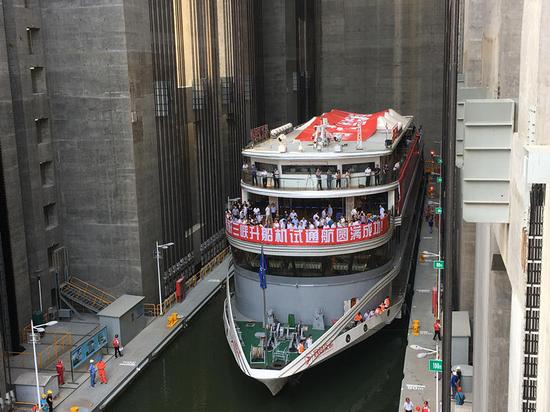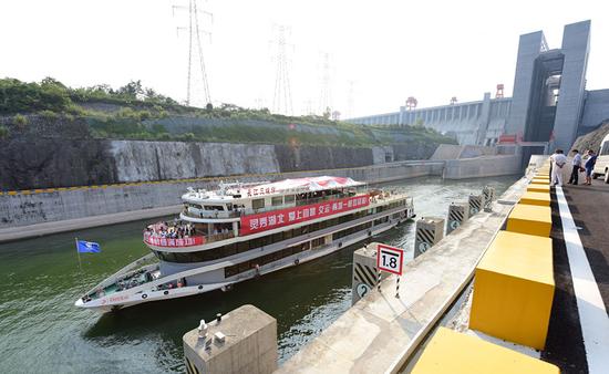 9月18日,“長江三峽9號(hào)”游輪駛離升船機(jī)進(jìn)入下游引航道。新華社記者 程敏 攝