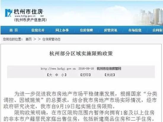 繼今年的“房價四小龍”蘇州、廈門、合肥、南京等熱點二線城市先后出臺樓市調控政策之后,杭州也伸出了調控之手。18日,杭州市住房保障和房產管理局公布了《杭州部分區域實施限購政策》,宣布自9月19日起實施住房限購,在市區限購范圍內暫停向擁有1套及以上住房的非本市戶籍居民家庭出售住房。