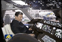 2014年5月23日,習近平在上海考察期間,在中國商飛設計研發中心C919大型客機展示樣機駕駛室察看,了解速度表、高度表、航跡圖等有關儀器儀表情況。