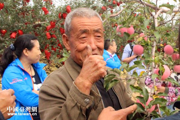 陜西省洛川縣洛陽村的陳成建老人對村里種植的蘋果贊不絕口。(中國臺灣網 張潔 攝)