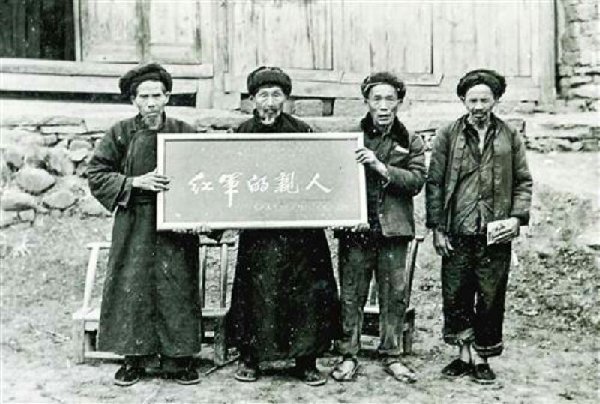 1984年,秀山縣政府向李木富老人(左二)贈送題寫著“紅軍的親人”的匾額(資料照片)。 新華社發
