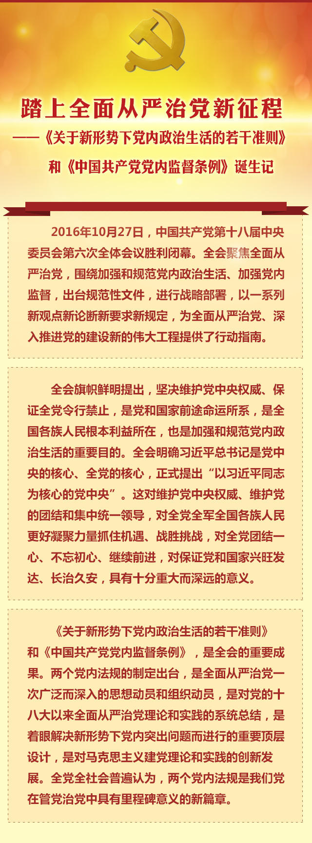 2016年2月,中央政治局作出決定,黨的十八屆六中全會(huì)專題研究全面從嚴(yán)治黨問題,制定新形勢(shì)下黨內(nèi)政治生活的若干準(zhǔn)則,修訂《中國(guó)共產(chǎn)黨黨內(nèi)監(jiān)督條例(試行)》,文件起草工作的大幕正式拉開。