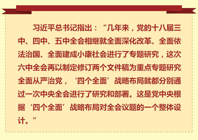 六中全會(huì)閉幕后,有外電評(píng)論:“四個(gè)全面”戰(zhàn)略布局將中共管黨治黨提升到了國(guó)家發(fā)展戰(zhàn)略的新高度;這次全會(huì)對(duì)全面從嚴(yán)治黨作出新部署,鞏固了“四個(gè)全面”戰(zhàn)略布局治國(guó)理政總方略的地位。
