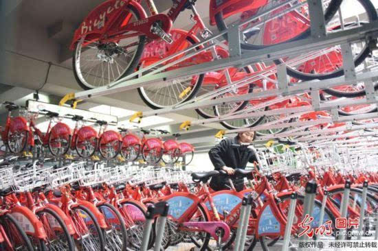 當(dāng)日,杭州首個(gè)公共自行車立體停車裝置在位于杭州東站東廣場下的公共自行車閘機(jī)式服務(wù)點(diǎn)投入試用。該裝置分上下兩層,由一排豎立支架和數(shù)十個(gè)可滑動的獨(dú)立停車托架組成,將自行車推入托架后即可輕松地移送至上層停放,上層停滿后再停放下層,同樣的占地面積能提高一倍的儲車量,有效緩解人們租不到車或停不進(jìn)車的尷尬,特別適合設(shè)置在人流密集、租車需求量較大的地段。(朱引煒攝/光明圖片)