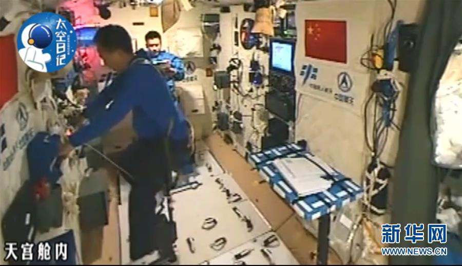 11月7日,新華社太空特約記者、航天員陳冬在天宮二號介紹航天員在太空中怎樣鍛煉身體,與地面健身相比有哪些不一樣的感覺。這是航天員在天宮艙內鍛煉。新華社發(中國航天員中心提供)圖片來源:新華網