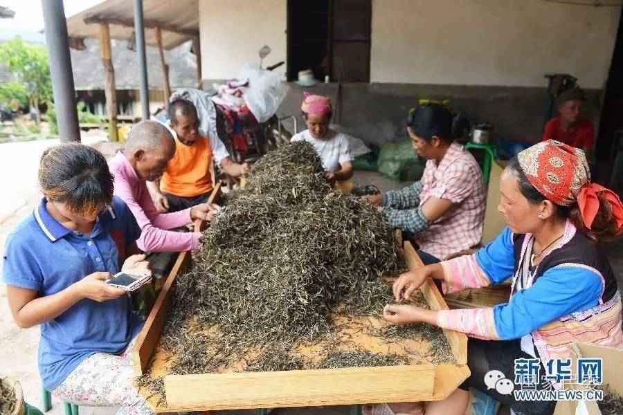 一名基諾族婦女(左一)在挑揀茶葉間隙使用手機。