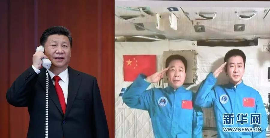 16時25分,景海鵬、陳冬到視頻通話位置并排站立,向習近平敬禮。習近平微笑著向2位航天員點頭致意,拿起電話機同航天員通話。親切的聲音通過電波傳向地球上空約380公里高度的天宮二號與神舟十一號組合體。