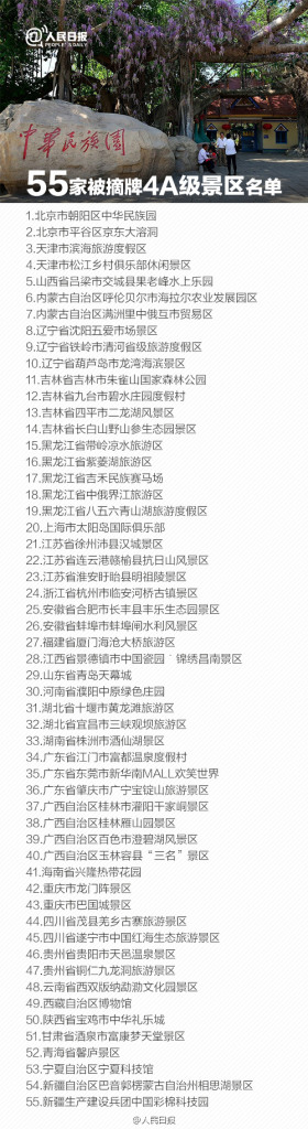 人民日?qǐng)?bào)記者王珂消息,國家旅游局今日通報(bào),截至目前,全國31個(gè)省區(qū)市均已完成對(duì)本地4A級(jí)及以下景區(qū)檢查,共有367家4A級(jí)及以下景區(qū)受到不同程度處理。其中,107家A級(jí)景區(qū)被摘牌,包括55家4A級(jí)景區(qū),黑龍江5家、吉林、廣西各4家、遼寧、江蘇、廣東各3家。