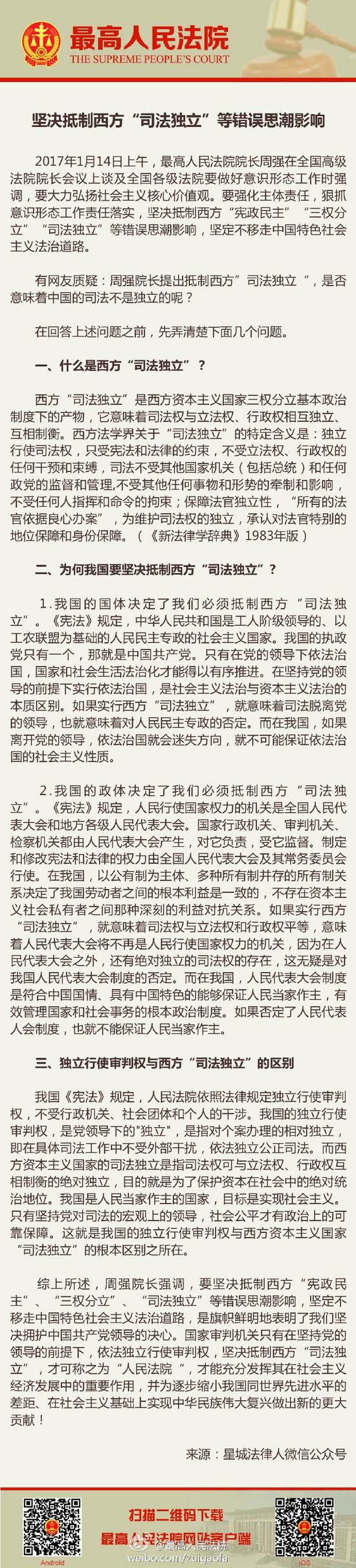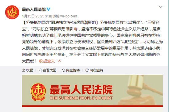 [堅決抵制西方“司法獨立”等錯誤思潮影響]堅決抵制西方“憲政民主”、“三權分立”、“司法獨立”等錯誤思潮影響,堅定不移走中國特色社會主義法治道路,是旗幟鮮明地表明了我們堅決擁護中國共產黨領導的決心。國家審判機關只有在堅持黨的領導的前提下,依法獨立行使審判權,堅決抵制西方“司法獨立”,才可稱之為人民法院,才能充分發(fā)揮其在社會主義經(jīng)濟發(fā)展中的重要作用,并為逐步縮小我國同世界先進水平的差距、在社會主義基礎上實現(xiàn)中華民族偉大復興做出新的更大貢獻!