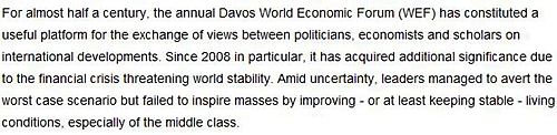 近半個世紀以來,一年一度的達沃斯世界經濟論壇為各國政要、商界精英、專家學者們就全球發展議題提供了一個極為有用的交換意見的平臺。尤其是自2008年以來,隨著金融危機給世界穩定帶來威脅,達沃斯論壇的重要性也隨之提升。在動蕩不安中,各國領導人用盡手段,雖然避免了最壞的結果,但人民生活水平、特別是中產階級,都或多或少地受到了危機的沖擊。