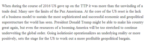 美國2016年宣布擱置TPP(跨太平洋伙伴關系協定),這絕不僅僅是一項貿易協議的松動,現在很多人都意識到“美國治下世界模式”的局限性。美國放棄TPP最根本原因是美國還沒能找到一種商業模式用來維系當前世界經濟和地緣上的復雜結構;蛟S新總統唐納德 特朗普真能讓美國再次偉大,但即便是一個繁榮發達的美國要想繼續主導全球秩序可能也會顯得捉襟見肘。走向孤立主義可以說是美國更現實的選擇。對美國來說,這至少可以讓她握有一個討價還價的砝碼。