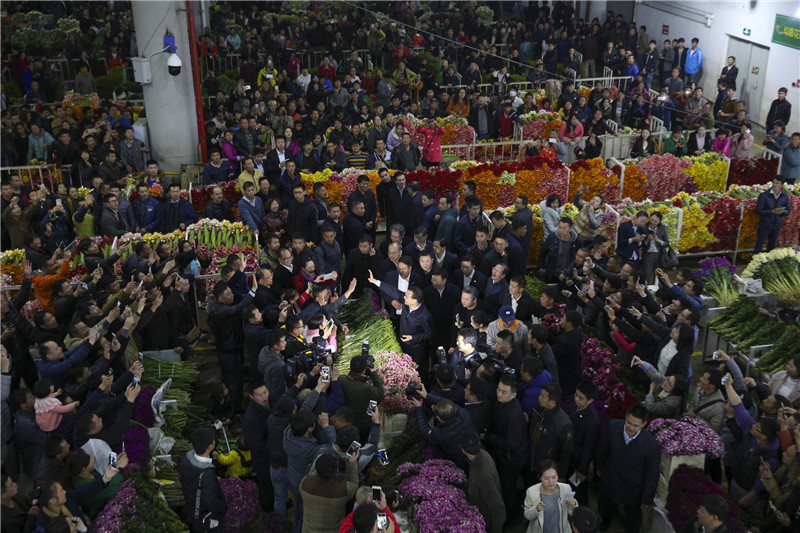 【總理夜訪昆明花市:關心起早貪黑的花農】春節將至,昆明斗南花卉市場內鮮花匯成七彩海洋。24日晚,總理意外到訪,讓這個人頭攢動的市場沸騰了。李克強仔細詢問鮮花品種價格,關心花農收入,還自掏腰包買了兩束花。總理說:“你們起早貪黑、辛苦勞作,給全國人民送去歡樂吉祥。我祝福你們春節快樂!”