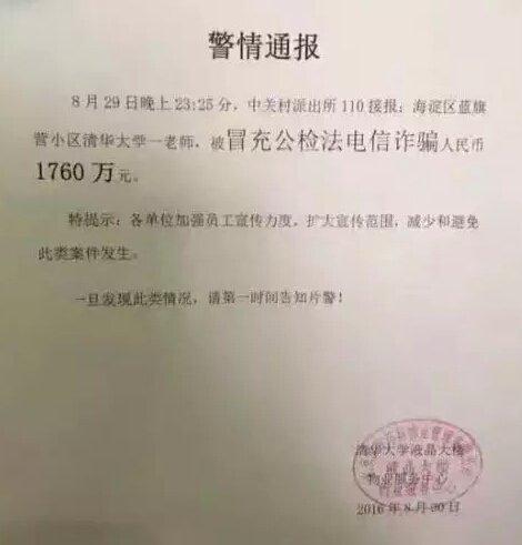 據了解,2016年7月,54歲的北京清華大學黃姓女教授遭假冒的大陸檢察院人士以微信實施詐騙,共被騙走人民幣1800多萬元。