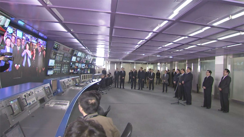 在中央電視臺《新聞聯播》演播室、導播室,習近平向主持人和工作人員了解新聞制播流程,并親自切換按鈕體驗模擬播出。