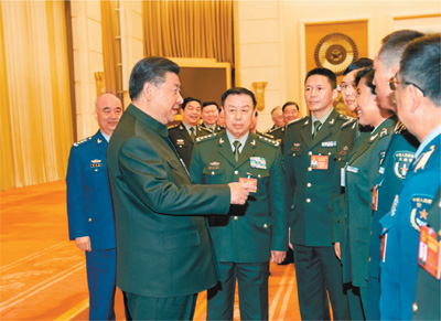 代表發言后,習近平發表重要講話。他強調指出,黨的十八大以來,在黨中央和中央軍委領導下,全軍圍繞實現強軍目標,統一思想,抓緊工作,國防和軍隊改革實現歷史性突破,軍事斗爭準備取得重大進展,反腐敗斗爭形成壓倒性態勢,我軍建設呈現嶄新氣象。