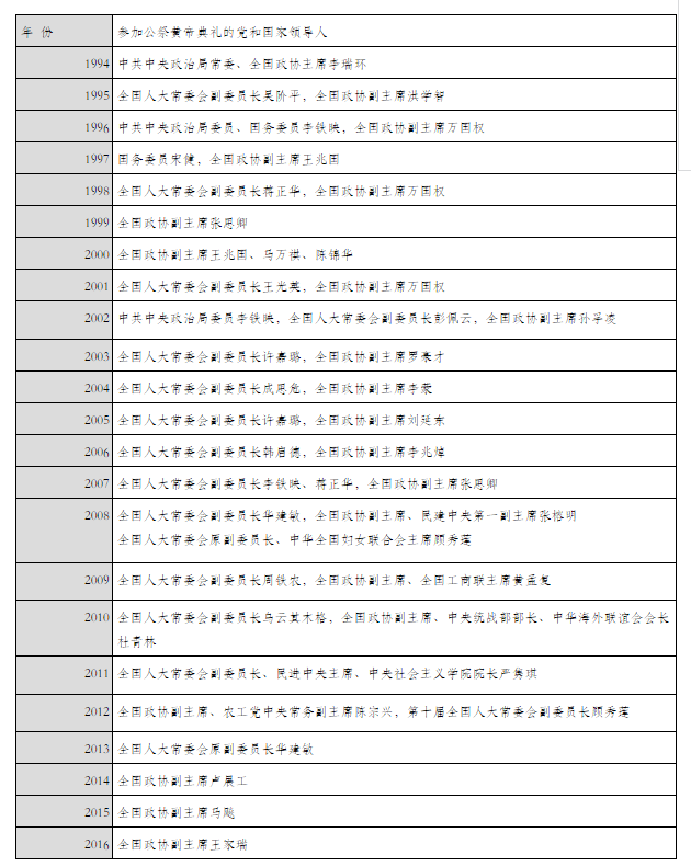 除了省部級領導,還有國家級領導人參加。公祭軒轅黃帝網的信息顯示,自1994年以來,每年清明都有黨和國家領導人專程赴黃帝陵參加清明公祭軒轅黃帝典禮。列表如下