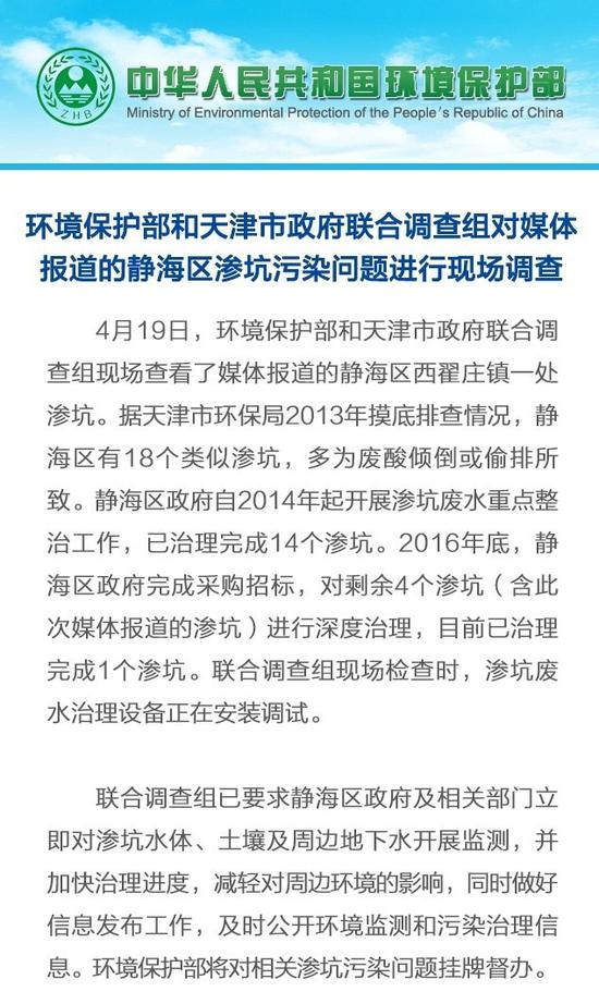 原標題:環保部將對天津靜海區滲坑污染問題掛牌督辦