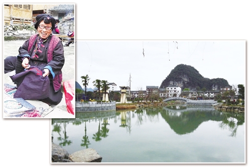 左上圖:廣西龍勝黃洛村瑤族阿媽潘鳳連在繡花,她的繡品受到游客喜愛。右下圖:湖南江永勾藍瑤村村景。(經濟日報記者 隋明梅攝)