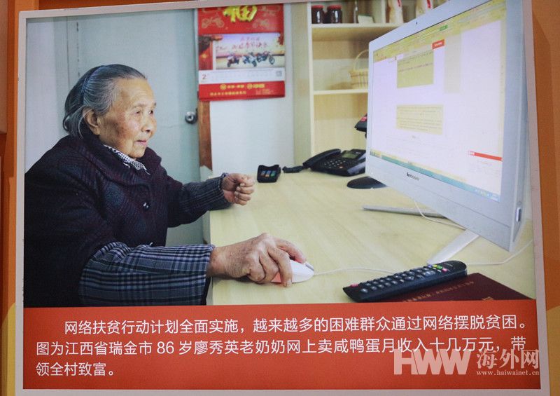 今年86歲的廖秀英老奶奶是咸鴨蛋腌制手藝人,也是位不折不扣的網絡達人。文化建設展區的墻上,有一副廖奶奶認真操作電腦的照片,非常醒目。從事醫護工作的羅女士說,老人上網就很少見,而八旬老人靠網上賣咸鴨蛋“月收入十幾萬元”,簡直是難以置信!