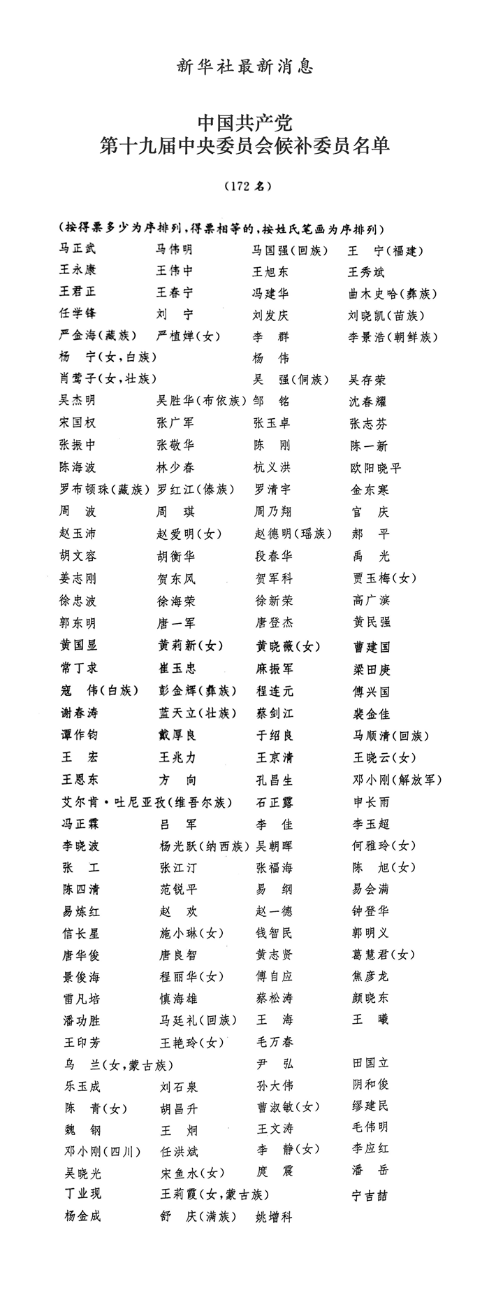 中國共產黨第十九屆中央委員會候補委員名單