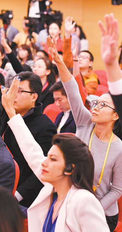 在十九大新聞中心舉行的記者招待會上,中外記者在提問。