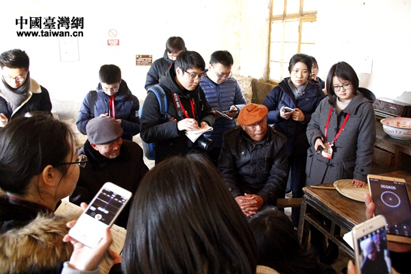 記者們?cè)凇爱?dāng)年農(nóng)家”采訪(fǎng)“大包干”帶頭人嚴(yán)金昌(頭戴灰色小帽者)與當(dāng)年一起“大包干”的農(nóng)民(中國(guó)臺(tái)灣網(wǎng) 王鑫 攝)
