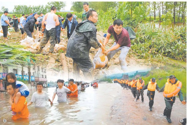 圖①:棗莊干群攜手在嶧城底閣鎮母子河搶險堵塞堤壩決口。□張環澤 趙峰 報道
