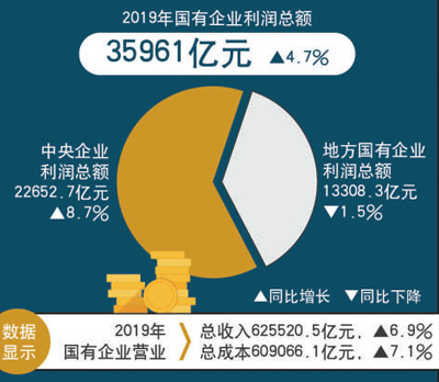 2019年,國有企業營業總收入625520.5億元,同比增長6.9%。其中,中央企業358993.8億元,同比增長6.0%;地方國有企業266526.7億元,同比增長8.2%。