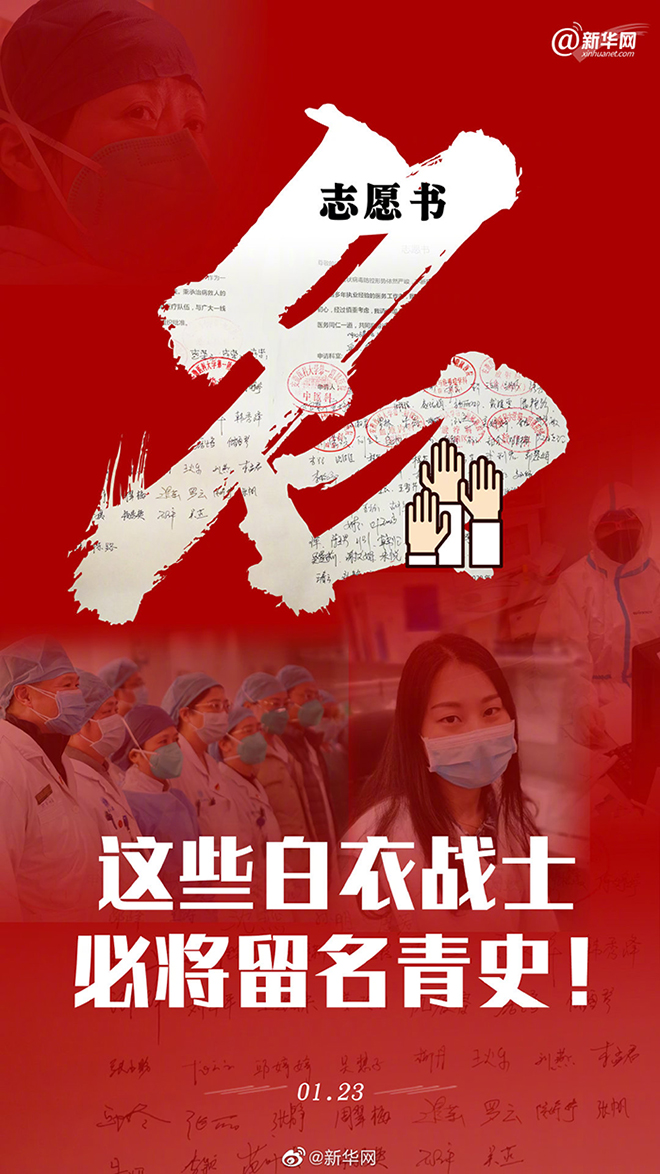 “我深知這場戰(zhàn)役的艱巨性”“下一站天門南,我下車回武漢”“我報名”……新型冠狀病毒肺炎疫情防控形勢嚴峻,不斷攀升的數(shù)字讓人揪心、痛心。但這些天,全國各地那些醫(yī)護人員的話,常常讓我們熱淚盈眶!1月23日,又見安徽百余名醫(yī)護人員在志愿書上簽名,請求去一線抗擊新型肺炎。張慧、孫朋、劉平平、沈佳佳、方芳……一個個普通的名字,卻讓人肅然起敬!他們也是普通人,也是某個人的父母或孩子。但現(xiàn)在,他們是醫(yī)生,是護士,是白衣戰(zhàn)士!這場戰(zhàn)役必將勝利,也請你們務(wù)必好好保護自己,平安歸來。