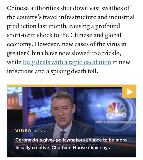 奧尼爾指出,中國上個月停止大量工業生產、關閉眾多旅游設施,這對中國和全球經濟造成了短期沖擊。但是,如今,中國新增新冠肺炎確診病例大幅減少,而意大利疫情卻迅速升級,死亡人數激增。