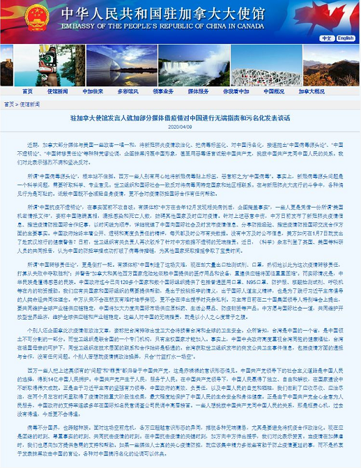 駐加拿大使館發言人就加部分媒體借疫情對中國進行無端指責和污名化發表談話