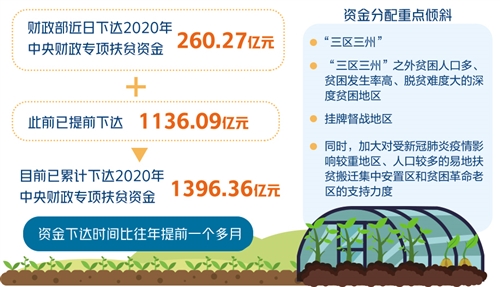 如期高質量打贏脫貧攻堅戰,資金保障十分重要。近日,財政部下達各地2020年中央財政專項扶貧資金260.27億元,加上提前下達的資金,目前已累計下達2020年中央財政專項扶貧資金1396.36億元,下達時間比往年提前一個多月。