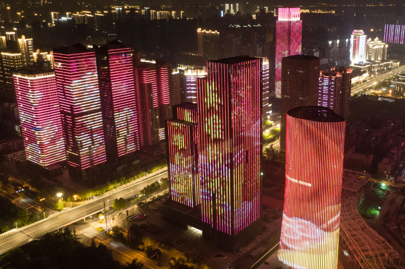 4月8日零時起,武漢市正式解除離漢離鄂通道管控措施,全市景觀照明開啟(無人機照片)。新華社記者 程敏 攝